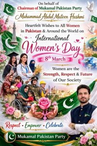 مکمل پاکستان پارٹی کے چیئرمین محمد عبدالمتین ہاشمی صاحب نے عالمی یومِ خواتین پر اپنے خصوصی پیغام میں کہا کہ ہر سال 8 مارچ کو دنیا بھر میں عالمی یومِ خواتین منایا جاتا ہے۔اس دن کا مقصد خواتین کے حقوق،عزت،وقار اور معاشرے میں ان کے کردار کو اجاگر کرنا ہے۔جدید دنیا میں اس دن کو خواتین کی آزادی، برابری اور سماجی انصاف کے تناظر میں دیکھا جاتا ہے اگر اسلامی تعلیمات کی روشنی میں خواتین کے مقام و مرتبے کا جائزہ لیا جائے تو معلوم ہوتا ہے کہ اسلام نے چودہ سو سال پہلے ہی خواتین کو وہ حقوق عطا کر دیے تھے جن کے لیے آج دنیا آواز اٹھا رہی ہے۔